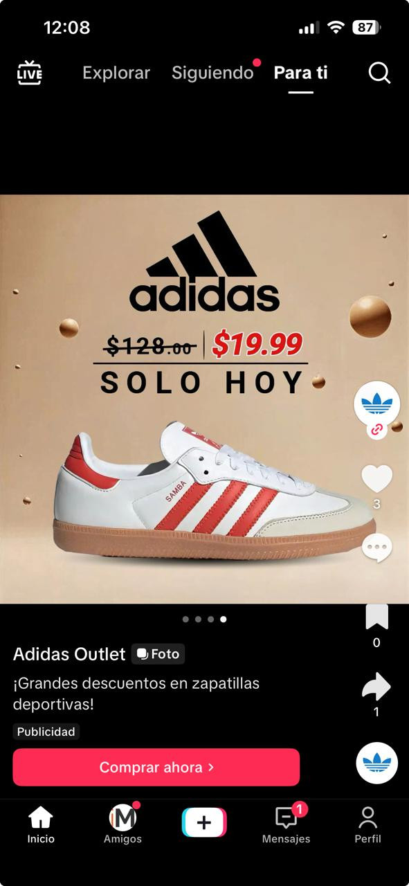 Los anuncios —publicados desde una cuenta denominada «Adidas Outlet» y etiquetados como publicidad pagada en la plataforma— muestran modelos como las Adidas Samba a $19.99, cuando su precio real supera los $128. El mensaje «Solo Hoy» refuerza la urgencia para que el usuario haga clic sin verificar la fuente.
