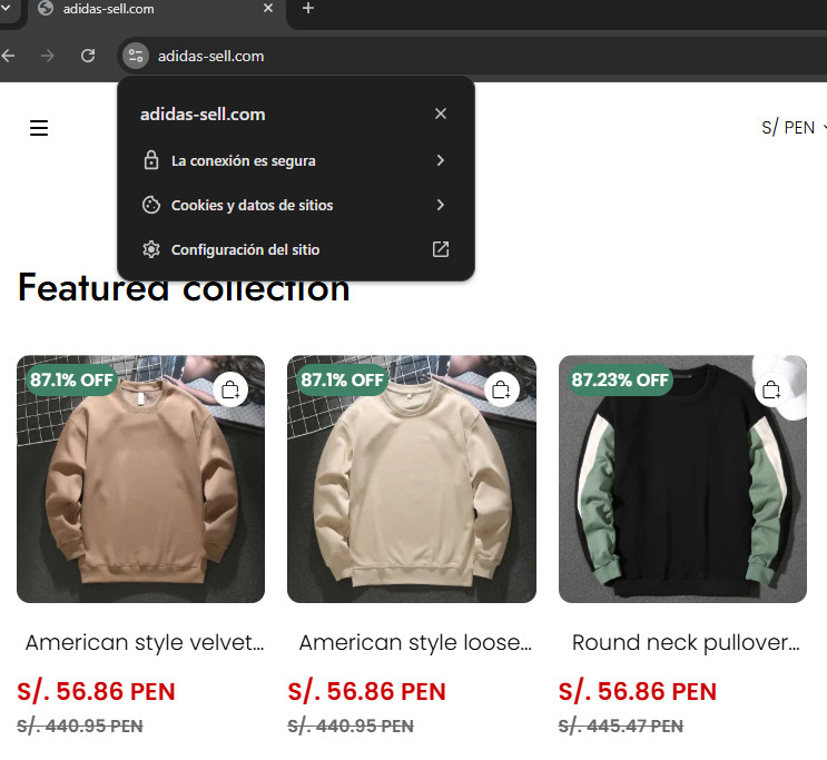 Sin embargo, el dominio legítimo de Adidas es adidas.com; cualquier variante como «adidas-sell», «adidas-outlet» o similares es una señal de alerta inmediata.