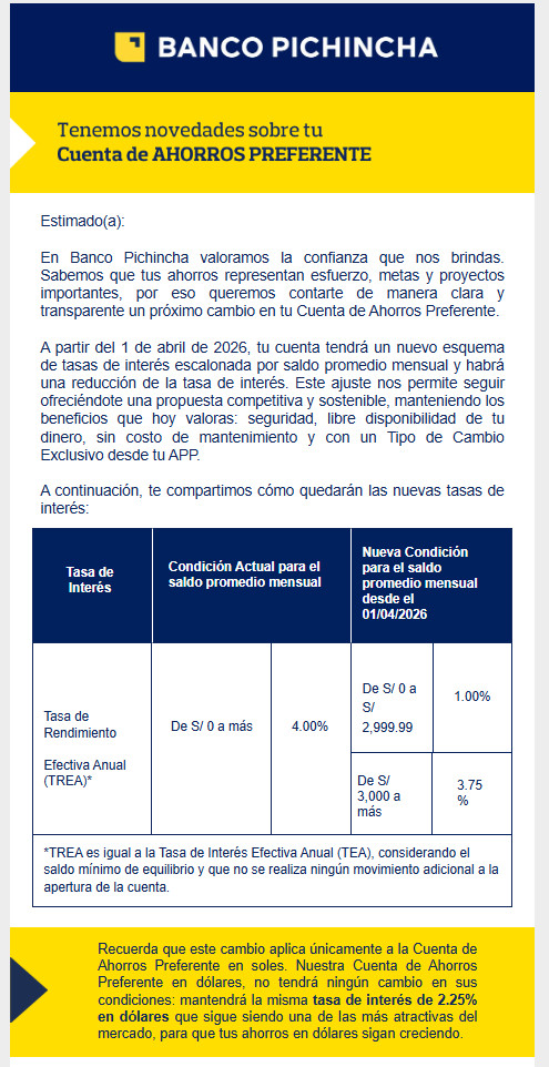 Banco Pichincha anunció una modificación en las condiciones de su Cuenta de Ahorros Preferente en soles, que entrará en vigencia el 1 de abril de 2026.