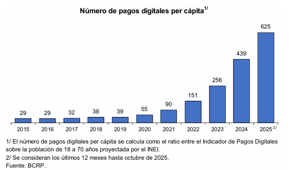 El Banco Central de Reserva del Perú (BCRP) informó que el número de pagos digitales realizados por persona adulta alcanzó las 625 operaciones en 2025, frente a las 90 registradas en 2021.
