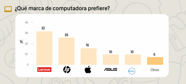En computadoras, Lenovo lidera con 32 %, seguida por HP (26 %) y Apple (16 %). Asus y Dell comparten el cuarto lugar con 10 % cada una.