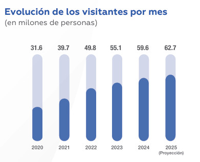 La afluencia mensual de visitantes también mostró un comportamiento ascendente. En 2020 se registraron 31.6 millones de visitas, cifra que subió a 39.7 millones en 2021, 49.8 millones en 2022, 55.1 millones en 2023 y 59.6 millones en 2024.
