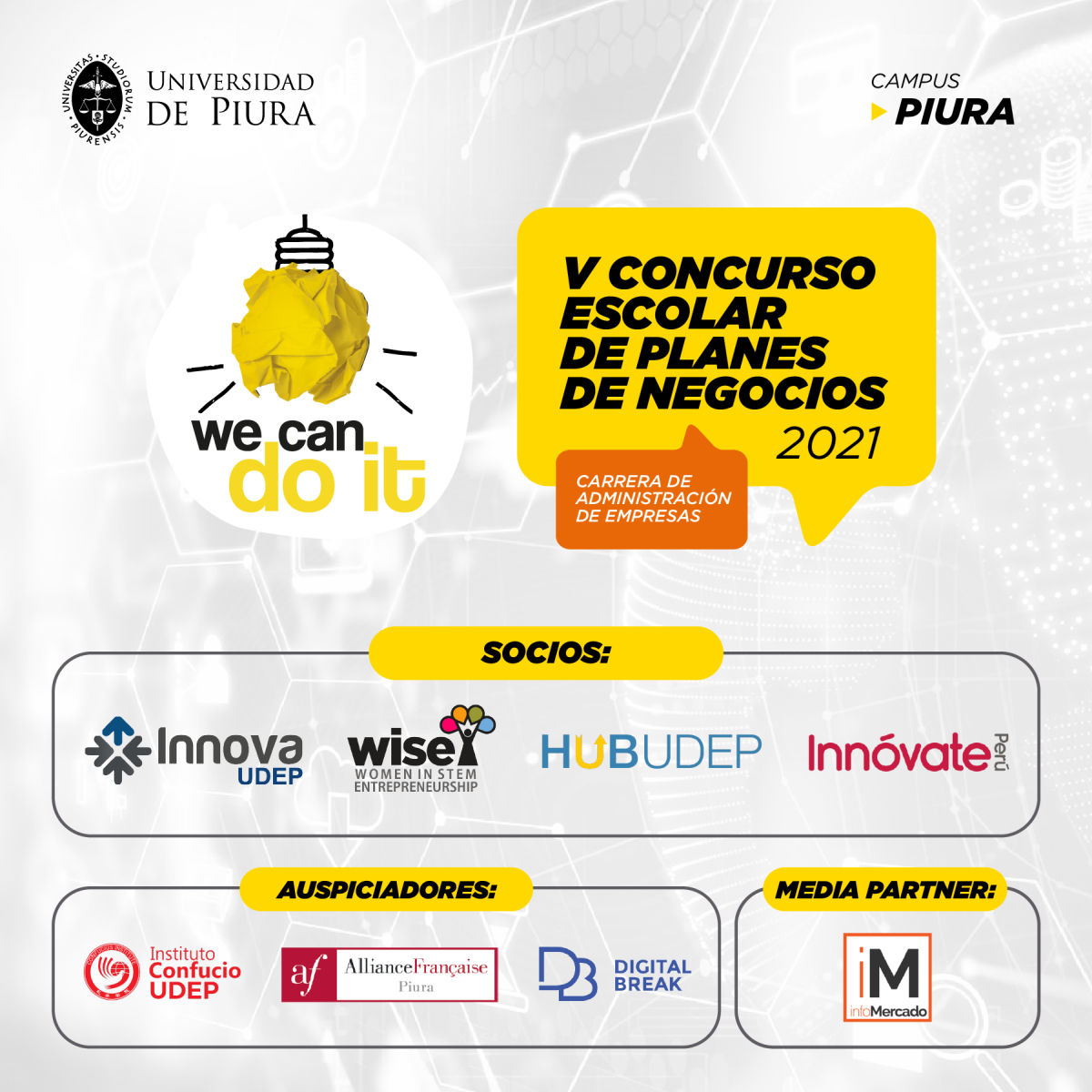 Con el objetivo de motivar la innovación y el emprendimiento desde la etapa escolar, el programa académico de Administración de Empresas de la Universidad de Piura presentó la quinta edición del concurso de ideas de negocio We can do it 2021, el cual está dirigido a escolares de cuarto y quinto año de secundaria de los colegios privados y públicos del país.