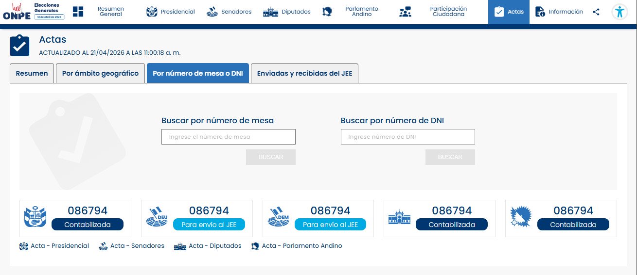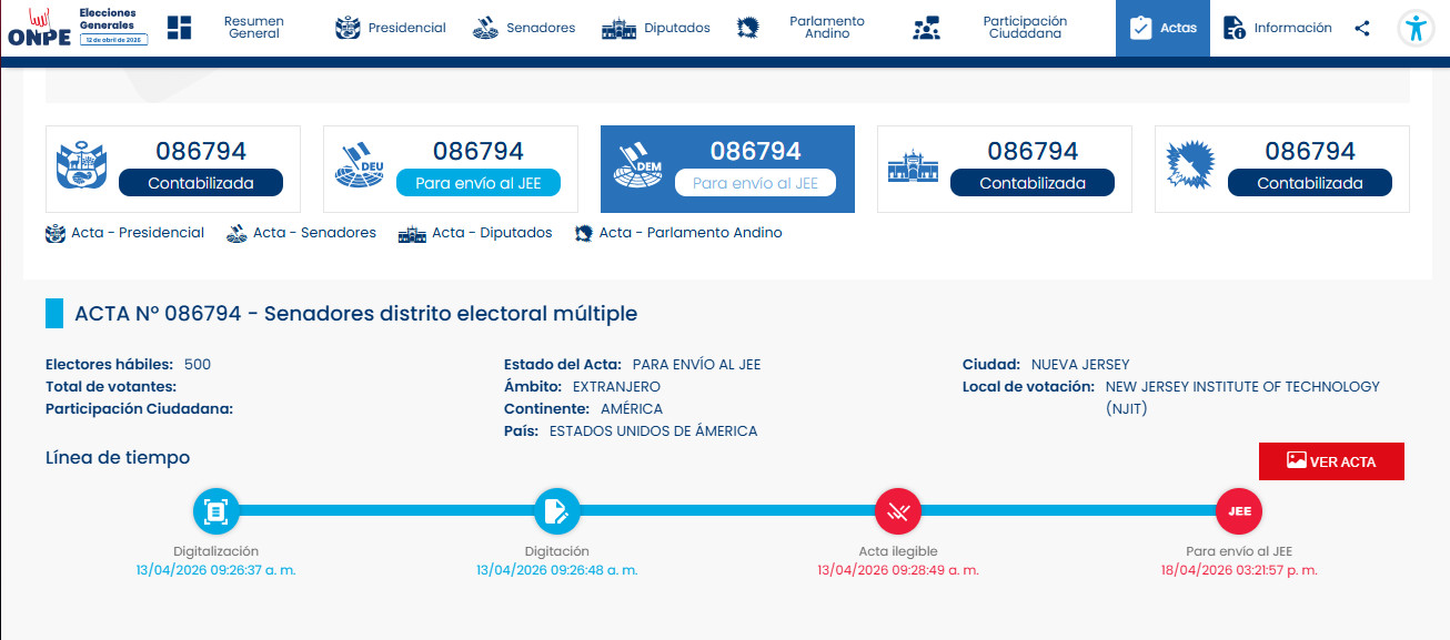 El estado actual del acta es “Para envío al JEE” (Jurado Electoral Especial), según la información publicada en la plataforma. Fue digitalizada el 13 de abril a las 9:26:37 a.m. y remitida al JEE el 18 de abril a las 3:21:57 p.m.