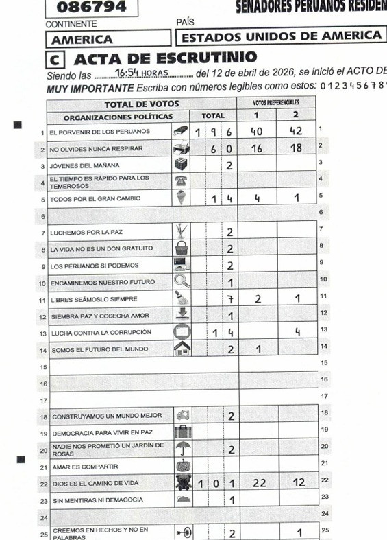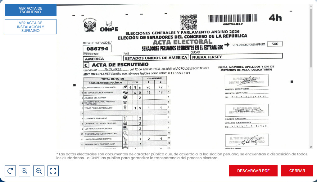 El hallazgo corresponde al acta Nº 086794, correspondiente a la elección de senadores por el distrito electoral múltiple en el extranjero. El documento, digitalizado el 13 de abril, fue puesto a disposición del público en la plataforma de resultados de la ONPE y muestra un listado de organizaciones políticas que no coinciden con ninguna de las 36 agrupaciones inscritas para los comicios del 12 de abril.