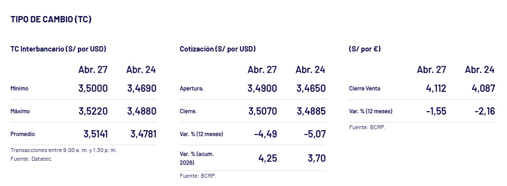 El tipo de cambio interbancario cerró al alza este lunes 27 de abril de 2026, ubicándose en S/3.50 por dólar, según datos oficiales del Banco Central de Reserva del Perú (BCRP).