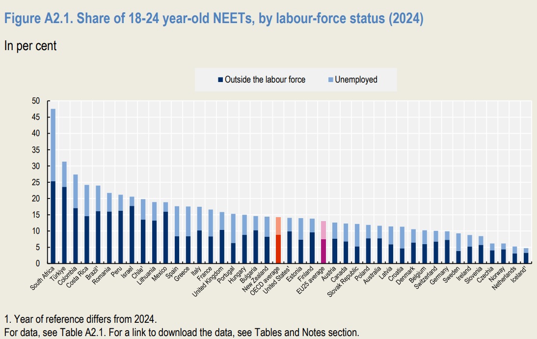 A nivel mundial, los países con mayores porcentajes de jóvenes NEET son: