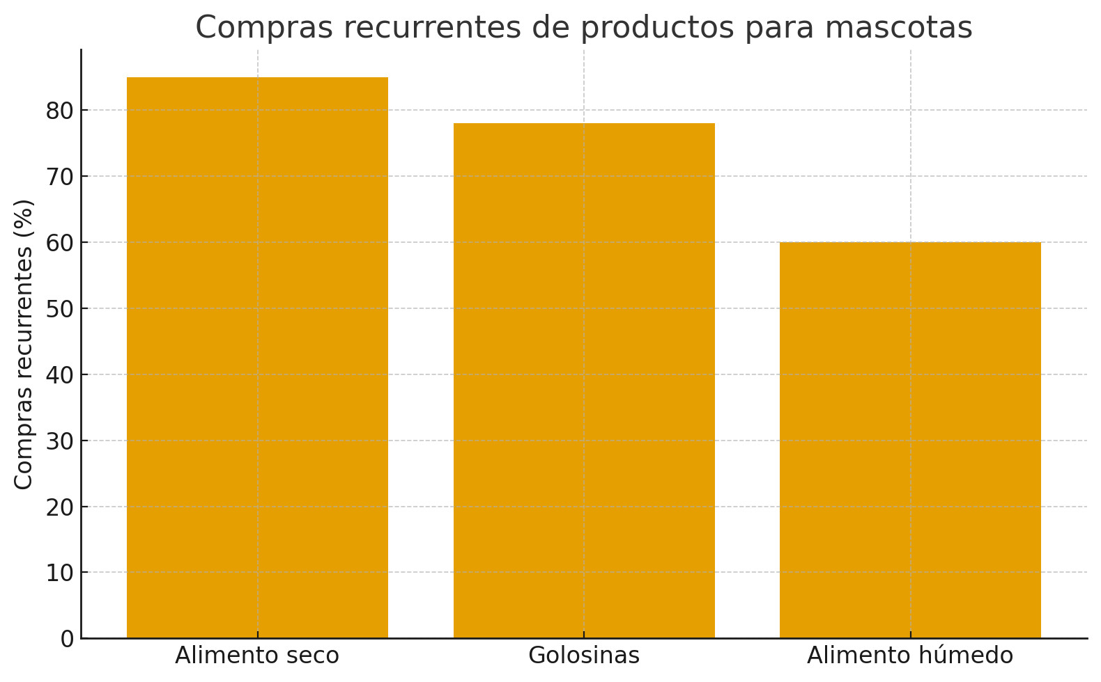 Entre las compras recurrentes figuran alimento seco (85%), golosinas (78%) y alimento húmedo (60%).