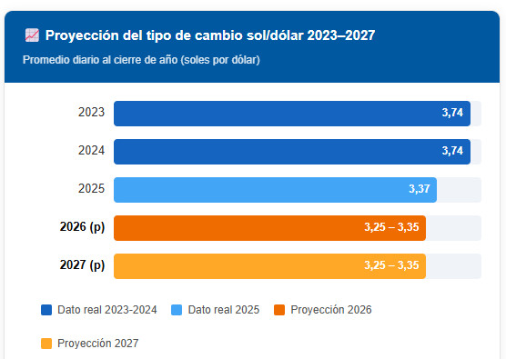 El banco proyecta que el tipo de cambio cerrará 2026 en un rango de 3,25 a 3,35 soles por dólar (promedio diario de diciembre), y que en 2027 se mantendrá en un nivel similar.