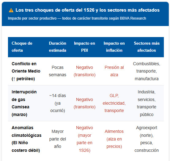 El optimismo de mediano plazo no debe ocultar que los próximos meses serán los más complejos del año para los empresarios. BBVA Research identifica tres choques de oferta negativos que coinciden en el primer semestre de 2026, y reconoce que su impacto combinado obligó a revisar a la baja la proyección de crecimiento del PBI para este año: de 3,1% a 2,9%.