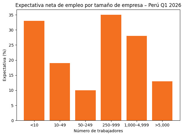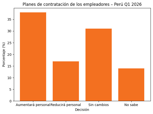 El 38% de los empleadores peruanos prevé incrementar el tamaño de su planilla entre enero y marzo de 2026. En tanto, el 17% anticipa una reducción de personal, el 31% no espera cambios en su dotación y el 14% señala que aún no tiene claridad sobre la evolución de su fuerza laboral.