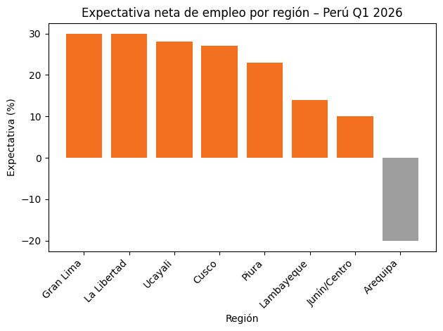A nivel global, la encuesta recoge respuestas de 39,063 empleadores en 41 países. La Expectativa Neta de Empleo promedio mundial para el primer trimestre de 2026 se sitúa en 24%, por encima del 18% reportado para Perú.