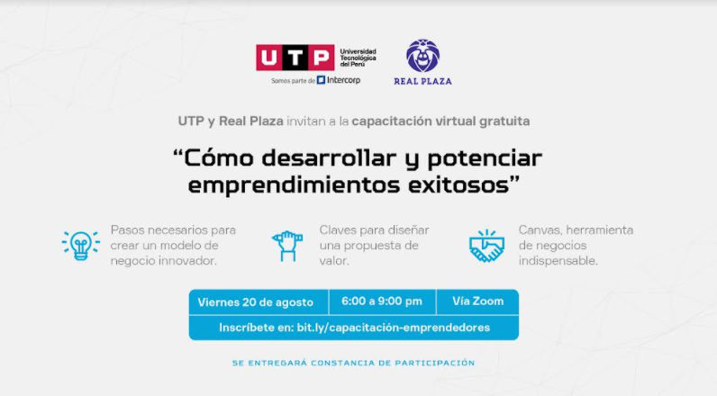 Real Plaza y la Universidad Tecnológica del Perú (UTP) se unen para brindar la capacitación virtual gratuita “Cómo desarrollar y potenciar emprendimientos exitosos”, dirigida a piuranos emprendedores o con interés en temas de emprendimiento.