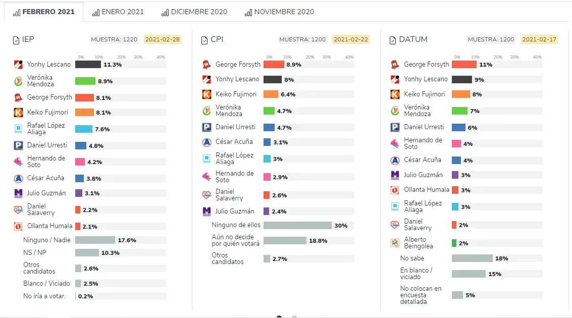 Aquí un informe de Ojo Público con los resultados de las diferentes encuestadoras registradas en el Jurado Nacional de Elecciones.