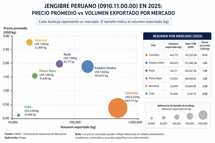 Un análisis desagregado por mercado de destino para el jengibre, elaborado con datos de SUNAT para 2025, expone diferencias de precio que no se explican por logística ni por volumen.