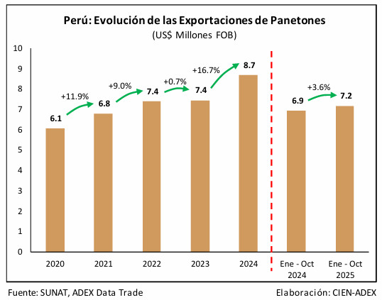Las exportaciones de panetones peruanos crecieron de forma sostenida entre 2020 y 2024 y, en los primeros diez meses de 2025, sumaron US$7.2 millones con un avance de 3.6% interanual, con Estados Unidos y Chile como mercados centrales según el Cien-Adex.