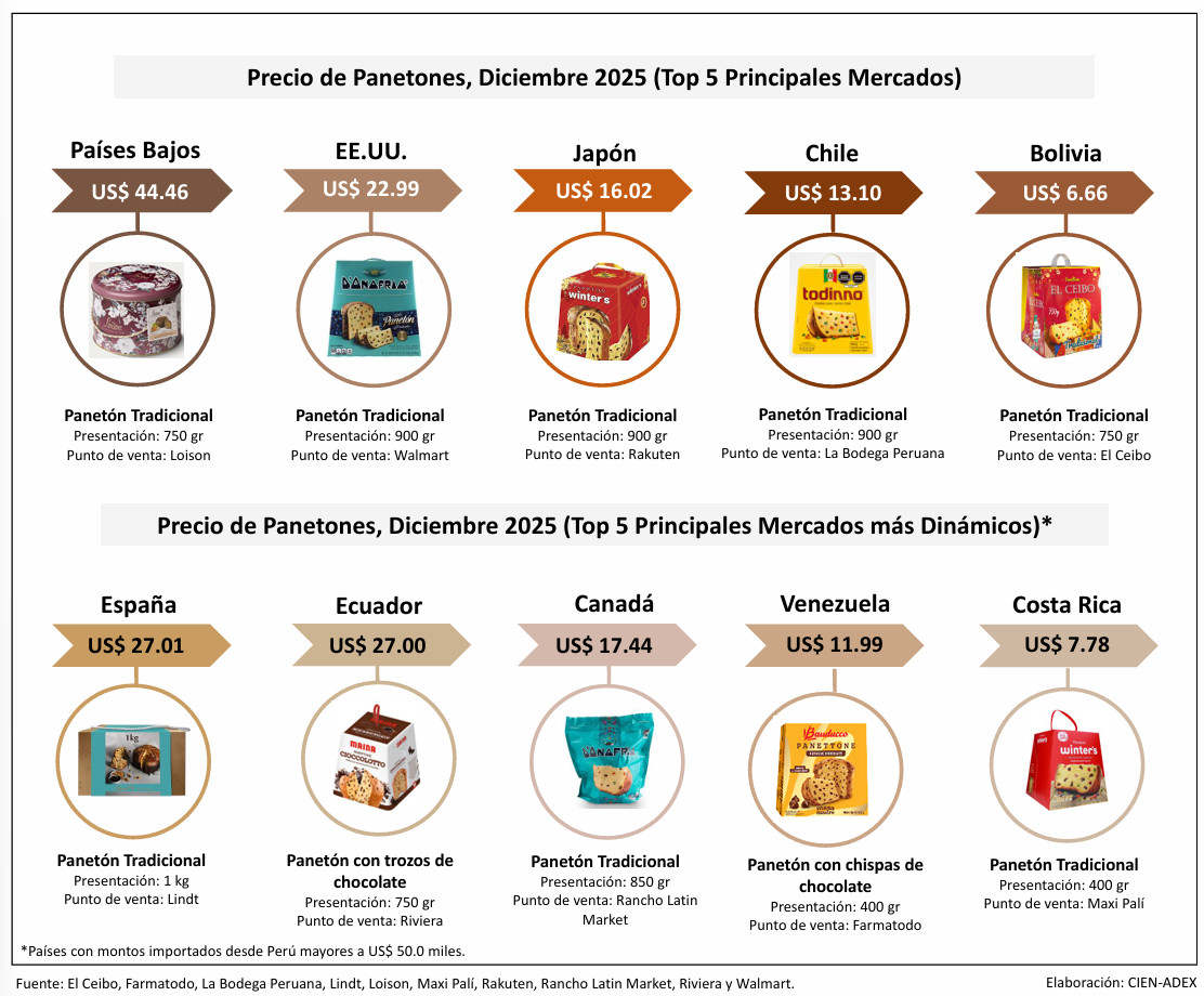 En diciembre de 2025, Cien-Adex registró precios de referencia al consumidor para panetones en mercados clave, como un panetón tradicional de 750 gramos a USD 44.46 en Países Bajos y uno de igual peso a USD 6.66 en Bolivia.