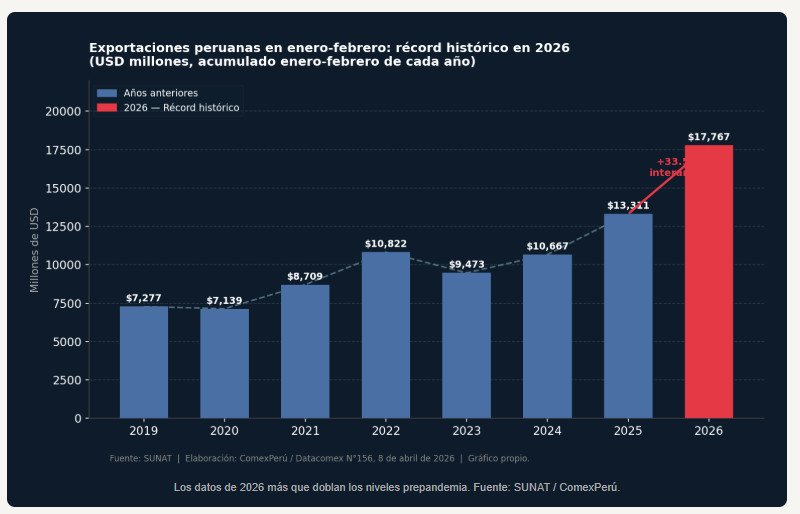 Las exportaciones peruanas sumaron USD17,767 millones en el acumulado de enero y febrero de 2026, su nivel más alto y un avance de 33.5% respecto al mismo período del año anterior, según el reporte Datacomex N°156 publicado este miércoles.