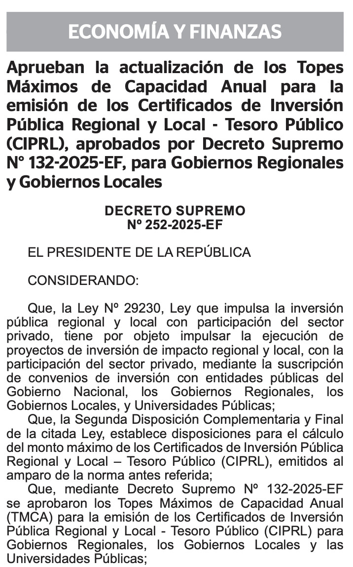 El Gobierno aprobó un Decreto Supremo que eleva en 50% los topes anuales para emitir Certificados de Inversión Pública Regional y Local (CIPRL), ampliando la capacidad de ejecución de proyectos mediante Obras por Impuestos (OxI).