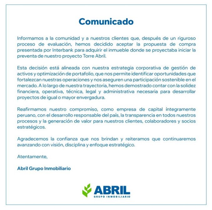 La transacción responde a la estrategia de Abril Grupo Inmobiliario de gestión de activos y optimización de portafolio, tras un análisis interno exhaustivo, según el comunicado oficial de la empresa de capital peruano.