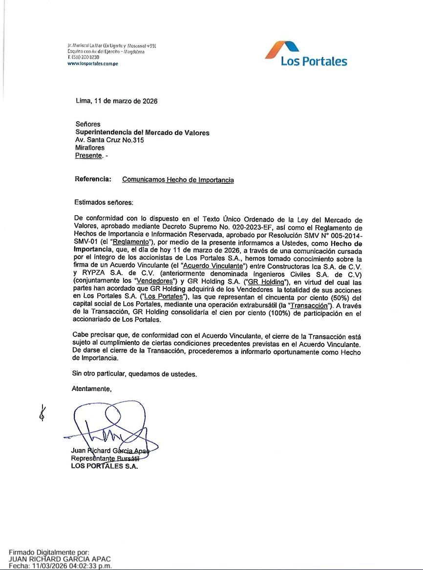 Una vez satisfechos esos requisitos, GR Holding comunicará el cierre al mercado mediante un nuevo Hecho de Importancia ante la SMV.