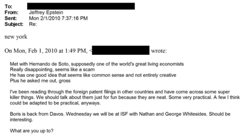 En un correo fechado el 1 de febrero de 2010, una interlocutora de Ghislaine Maxwell escribió que se había reunido con Hernando de Soto, a quien describió como “supuestamente uno de los grandes economistas vivos del mundo”, aunque señaló que el encuentro resultó “realmente decepcionante”.