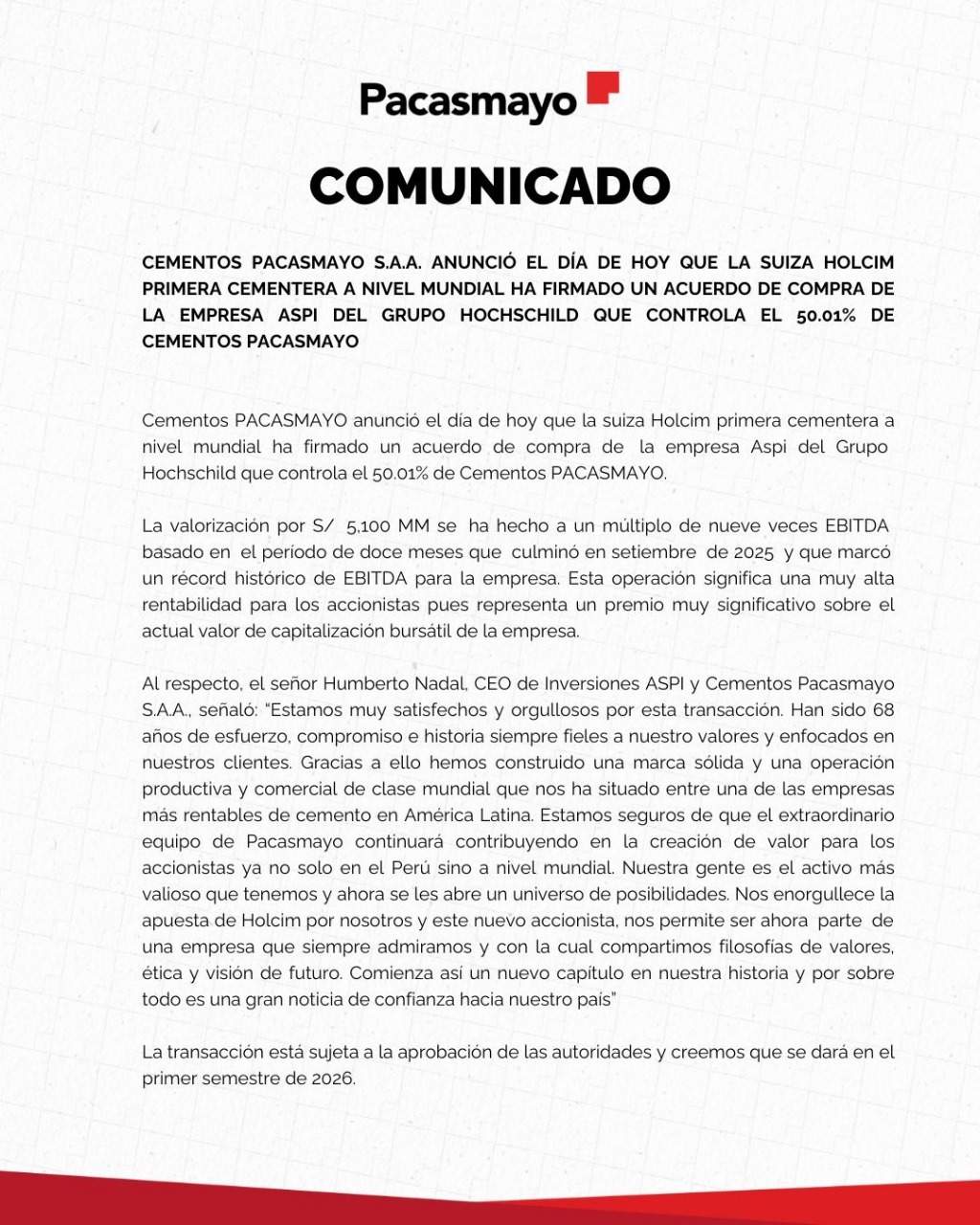 La transacción, sujeta aún a la aprobación de Indecopi y otros reguladores, se perfila como el mayor movimiento corporativo reciente en la industria de materiales de construcción de Perú y como una de las inversiones más relevantes de la multinacional suiza en Latinoamérica bajo su plan NextGen Growth 2030.