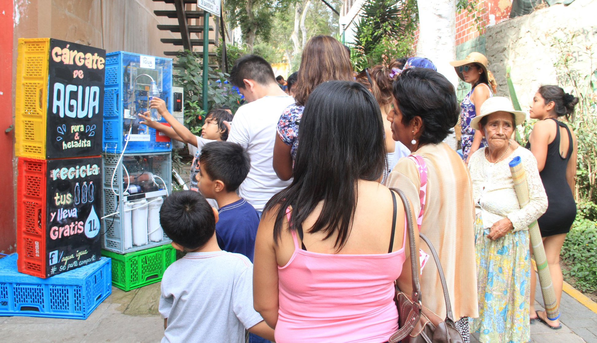 La primera fuente se instaló en la Bajada de Baños de Barranco. Era verano del 2017, el sol brillaba más que nunca en Lima y la gente circulaba como de costumbre. Fue la mejor forma de testear el producto. Niños, adolescentes y adultos, todos se servían agua de la máquina de Igua.