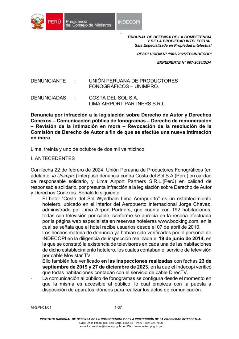 El Instituto Nacional de Defensa de la Competencia y de la Protección de la Propiedad Intelectual (Indecopi) impuso una multa al Hotel Costa del Sol Wyndham Lima Aeropuerto por el uso no autorizado de fonogramas en los televisores instalados en sus habitaciones entre agosto de 2020 y diciembre de 2023, periodo durante el cual no realizó el pago correspondiente de derechos de comunicación pública a la Unión Peruana de Productores Fonográficos (UNIMPRO).
