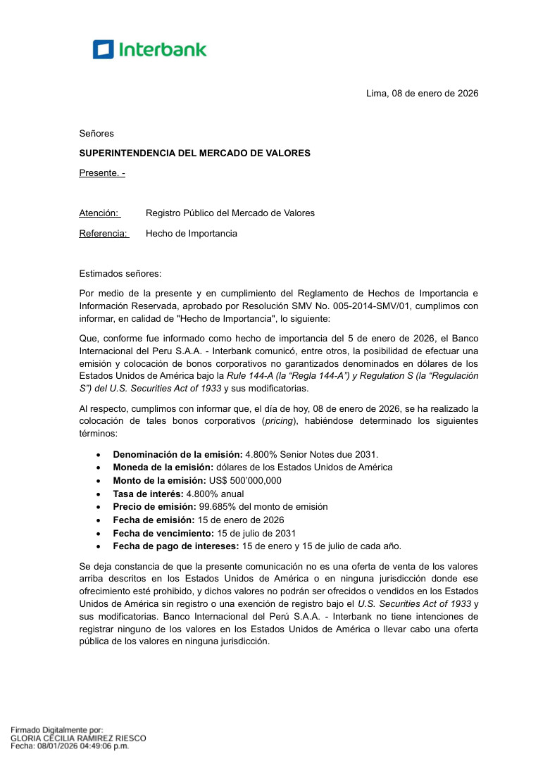 Interbank informó este viernes que realizó la mayor colocación de bonos senior en mercados internacionales de su historia, alcanzando un monto de US$500 millones.
