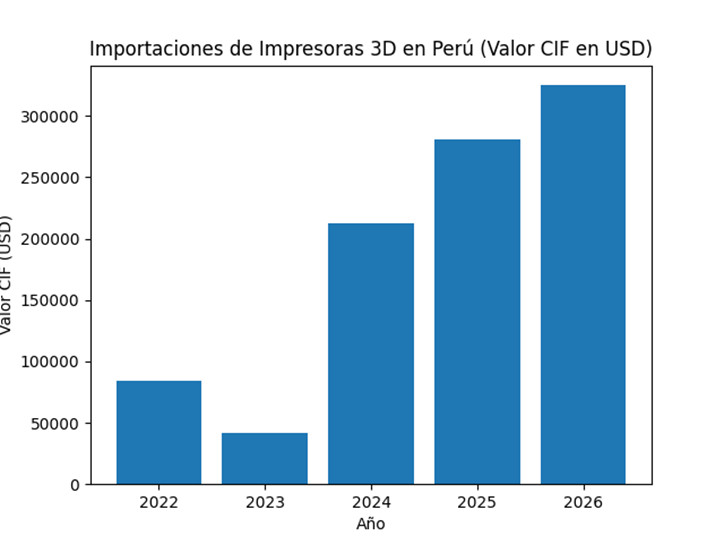 De acuerdo con data de la Superintendencia Nacional de Aduanas y de Administración Tributaria (SUNAT), las importaciones de impresoras 3D de plástico pasaron de US$ 84,615 en 2022 a más de US$ 325,000 acumulados a abril de 2026. En apenas cuatro años, la inversión en esta tecnología se multiplicó por casi cinco.