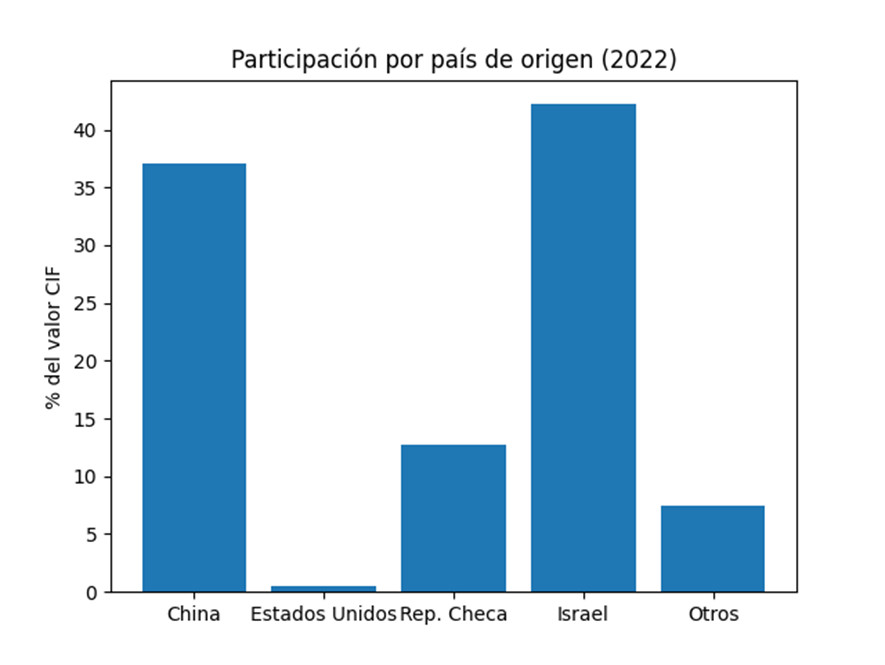 El origen de los equipos también se está reordenando. En 2022, el mercado peruano estaba dominado por China e Israel, mientras que Estados Unidos apenas concentraba el 0.5% del valor importado.