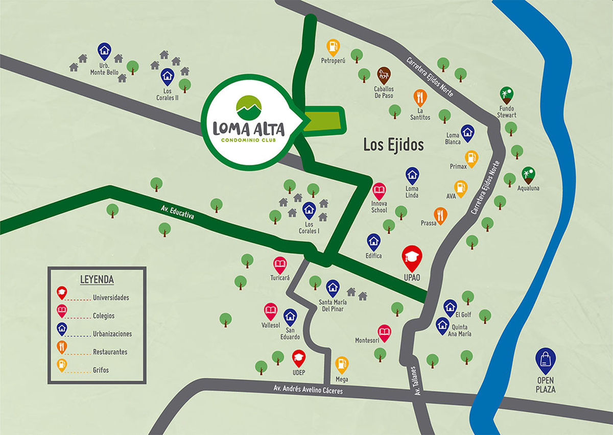 En Loma Alta habrá un Club House disponible para los propietarios con piscina, una cancha grass sintético, dos canchas de frontón, zona de parrilla, un restaurante concesionado y zona de descanso para leer o ver televisión.