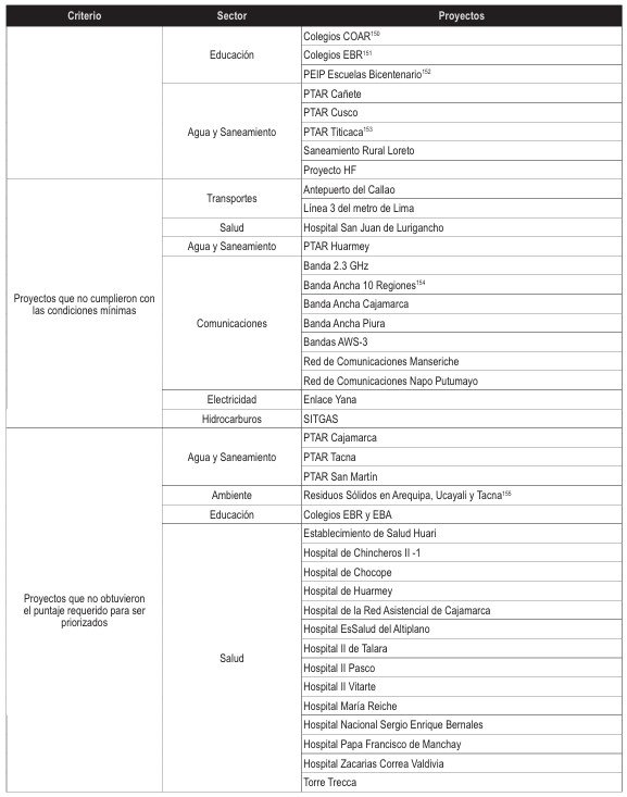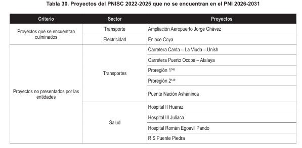 El documento del MEF confirma que 52 de los 72 proyectos del PNISC 2022-2025 no forman parte del nuevo plan. De estos, 17 no fueron presentados por las propias entidades responsables, 13 no cumplieron condiciones mínimas de evaluación y 19 no obtuvieron el puntaje requerido. Solo 2 proyectos fueron excluidos por haber culminado (Ampliación del Aeropuerto Jorge Chávez y Enlace Coya).
