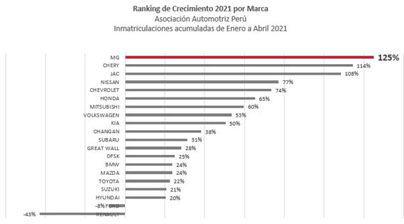 Según el Ranking por Marca de la Asociación Automotriz del Perú (APP) de Inmatriculaciones Acumuladas de enero a abril de este año, MG ha experimentado un crecimiento del 125% comparado con el mismo periodo anterior.