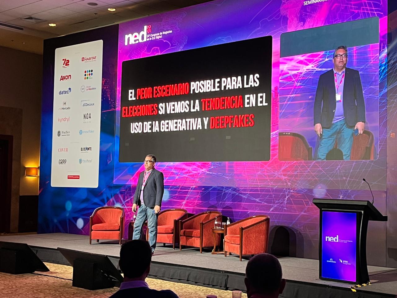 Posteriormente, Jesús Vélez abordó una de las amenazas más apremiantes de la era digital con su ponencia: «Voto bajo ataque digital: deepfakes, desinformación y rol de la IA en las elecciones». Vélez detalló cómo las tecnologías de manipulación avanzada y la desinformación a escala pueden afectar la confianza democrática y cómo la IA debe ser parte de la solución para detectar y mitigar estos ataques.