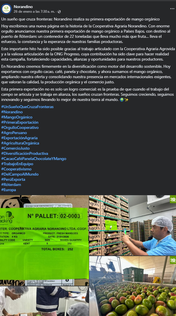 Norandino, con sede en Piura, ya participa en mercados internacionales con cacao, café, panela y chocolate. La incorporación del mango orgánico amplía su portafolio en un contexto de creciente demanda por productos certificados y de comercio justo en Europa.