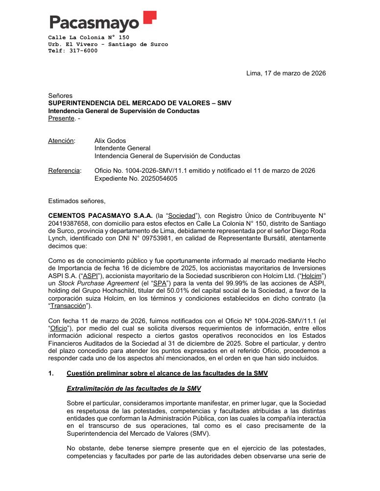 Cementos Pacasmayo S.A.A. respondió este 17 de marzo con un extenso escrito a los cuestionamientos formales de la Superintendencia del Mercado de Valores (SMV) sobre los costos que la empresa asumió en el marco de la adquisición de su control por parte de Holcim Ltd., y que en 2025 representaron el 33% de su utilidad neta, el 18% de su utilidad operativa y el 13% de su EBITDA consolidado.