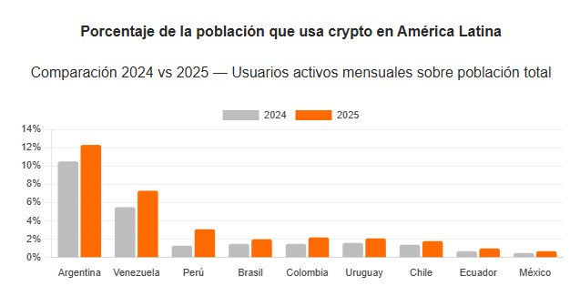 América Latina en su conjunto procesó más de 730 mil millones de dólares en volumen crypto durante 2025, con un crecimiento superior al 60% interanual, y concentra el 10% del volumen total global. La región creció tres veces más rápido que Estados Unidos en usuarios activos.