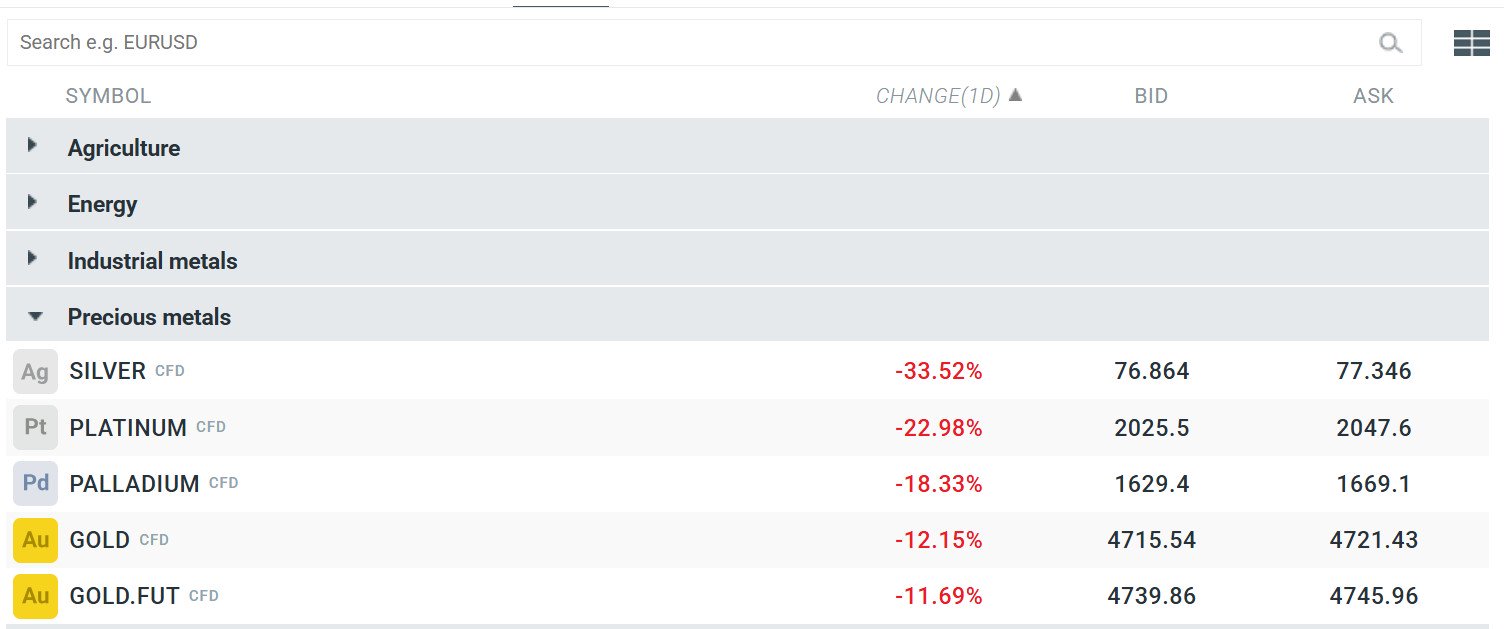El mercado internacional de metales preciosos cerró una jornada histórica con pérdidas que superaron cualquier registro previo en la negociación moderna. La plata encabezó el retroceso con una caída de 34% en un solo día, hasta cotizar en USD 76.5 por onza, mientras que el oro retrocedió 12% y se ubicó en USD 4,716 por onza.