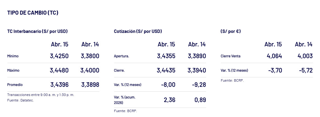El dólar estadounidense cerró este miércoles 15 de abril con una fuerte alza, alcanzando un valor de S/3.44 en el mercado interbancario, según el reporte de cierre del Banco Central de Reserva del Perú (BCRP).