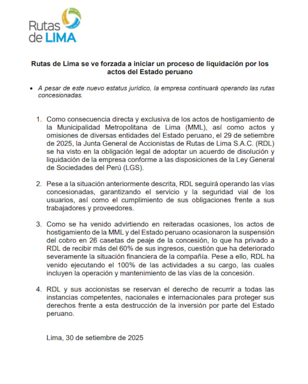 La concesionaria Rutas de Lima S.A.C., controlada por Brookfield y Odebrecht, anunció el inicio de su liquidación societaria como consecuencia de la pérdida de más del 60% de su facturación luego de la suspensión del cobro en 26 casetas de peaje en la capital.
