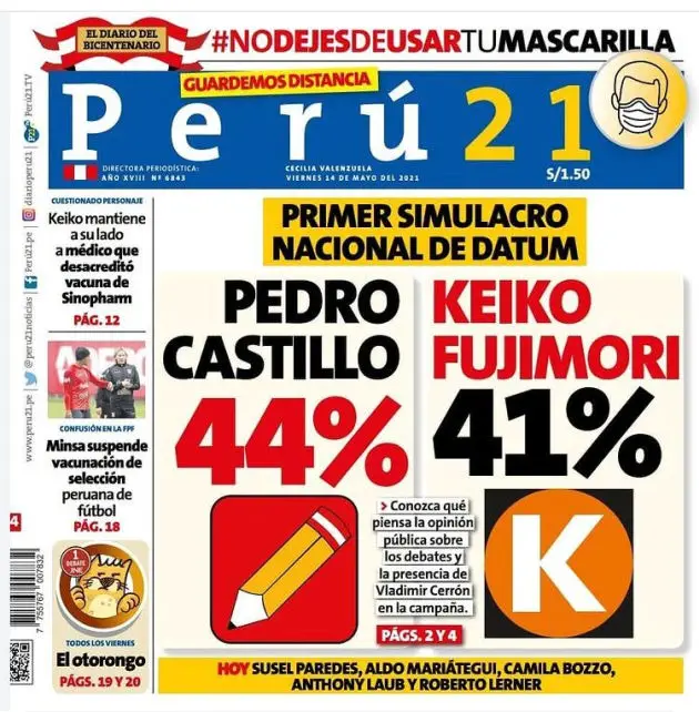 Este 14 de mayo se publicó en el Diario Perú 21 el primer Simulacro Nacional realizado por la encuesta Datum sobre la segunda vuelta de las Elecciones 2021.