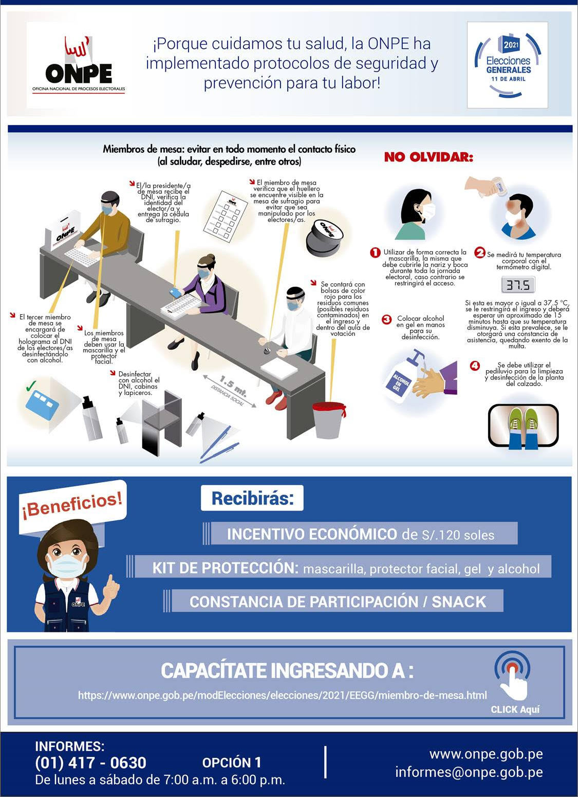 Cabe mencionar que los miembros mesa recibirán un bono de 120 soles por aceptar esta labor cívica en medio de una pandemia histórica que vive todo el mundo.