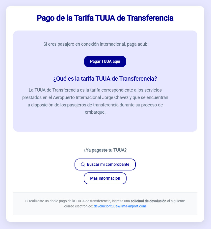 La TUUA de transferencia doméstica corresponde a los pasajeros que realizan conexiones entre regiones del país con escala en Lima. El monto asciende a USD 6.32 por persona, sin incluir IGV.