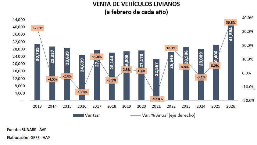 El mercado automotor peruano arrancó el 2026 con cifras sólidas: en los dos primeros meses del año se vendieron 41,584 vehículos livianos nuevos, lo que representa un alza de 36.8% frente al mismo periodo de 2025, informó la Asociación Automotriz del Perú (AAP).