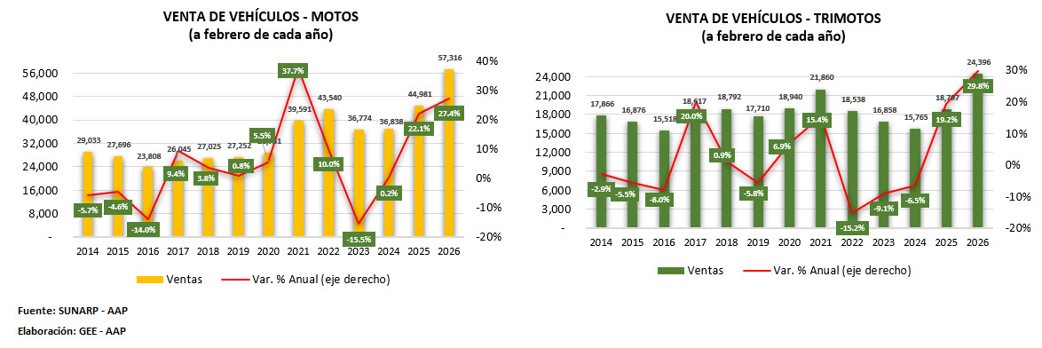 El segmento de dos y tres ruedas también mostró dinamismo. Las motos llegaron a 57,316 unidades vendidas a febrero (+27.4%), mientras que las trimotos alcanzaron 24,396 unidades (+29.8%).